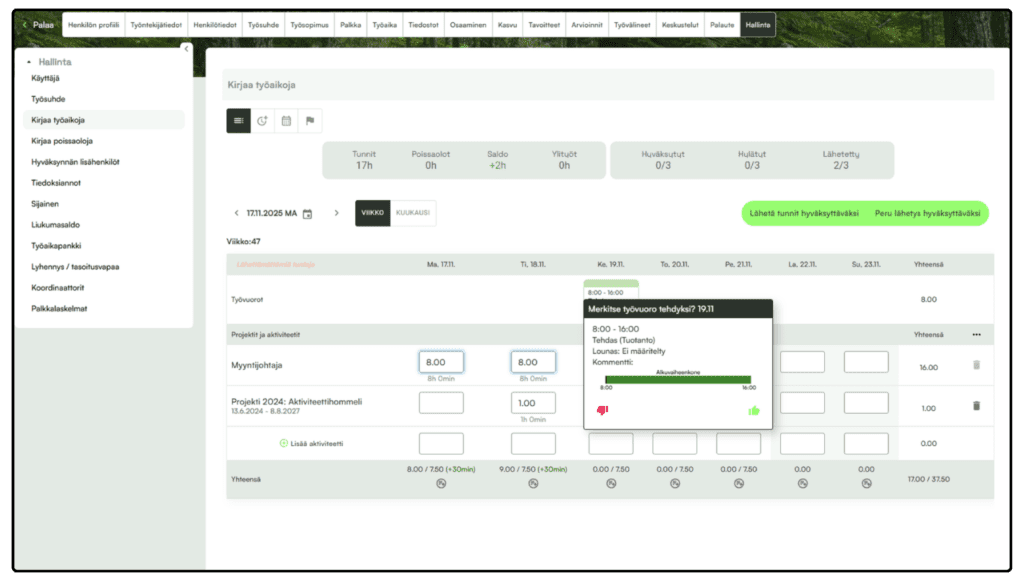 Työvuorosuunnittelun avulla voit optimoida resurssien käytön ja varmistaa, että oikeat henkilöt ovat oikeaan aikaan töissä. Lisäksi kaikki työaikaan liittyvät tiedot tallentuvat yhteen järjestelmään, mikä helpottaa raportointia ja palkanlaskenta.